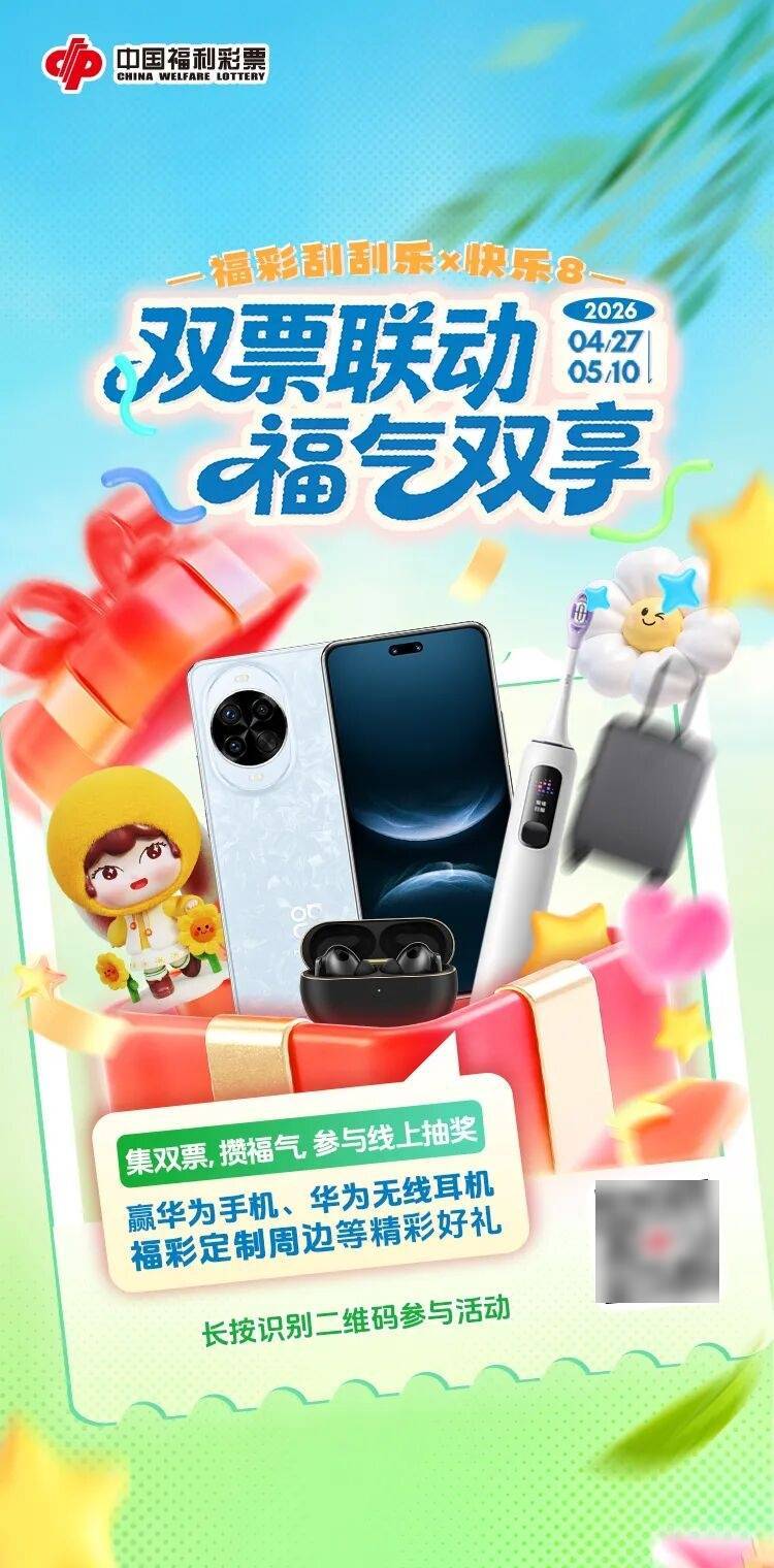 “星光灿烂30元”刮刮乐保安码和投注金额为10元及以上的快乐8游戏彩票营销二维码,即可积攒福气值参与抽奖活动,有机会赢华为手机NOVA14、华为耳机FREEBUDS PRO4、米家小米声波扫振电动牙刷PRO等福运好礼。