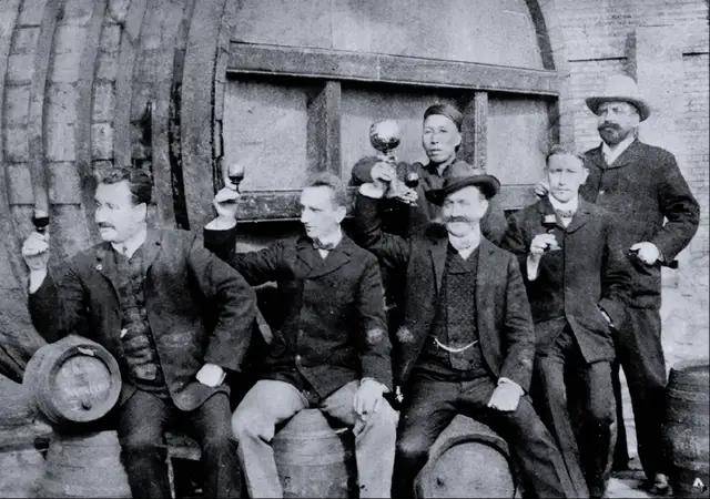 ▲1899年张裕酿出第一瓶葡萄酒;1899年张裕酿出第一瓶葡萄酒;1914年,张裕首位酿酒师巴保(第二排右一)、张裕首任总经理张成卿(第二排左一)与众多酿酒师举杯庆祝中国第一桶白兰地诞生。