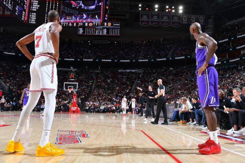 时光飞逝,一转眼到了今年,火湖大战又翻开了新的一页。重建完毕的火箭,就像突然中了彩票,迎来了杜兰特这位超级大咖的加盟。湖人这边呢,本来都顺利完成了从詹姆斯到东契奇的“交接棒”,可谁能料到,东契奇在季后赛前“哐当”一下就倒下了,里夫斯也因伤缺席,湖人的领袖宝座又“物归原主”,回到了詹姆斯手里。
