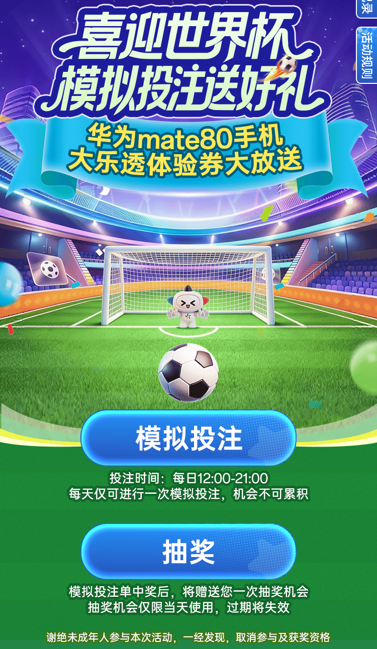 投注的赛事开奖后,若模拟投注预测与真实开奖赛果一致,即可获得一次抽奖机会,有机会获得Mate 80手机(或同等档次手机)1部或10元大乐透体验券1张。