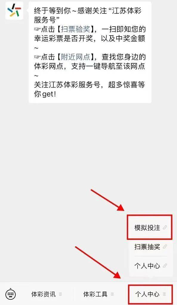 体验券使用流程:进入『江苏体彩服务号』菜单栏【个人中心】-【代金券列表】→ 找到可用体验券,出示动态二维码即可核销使用。