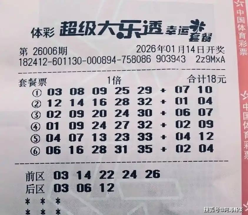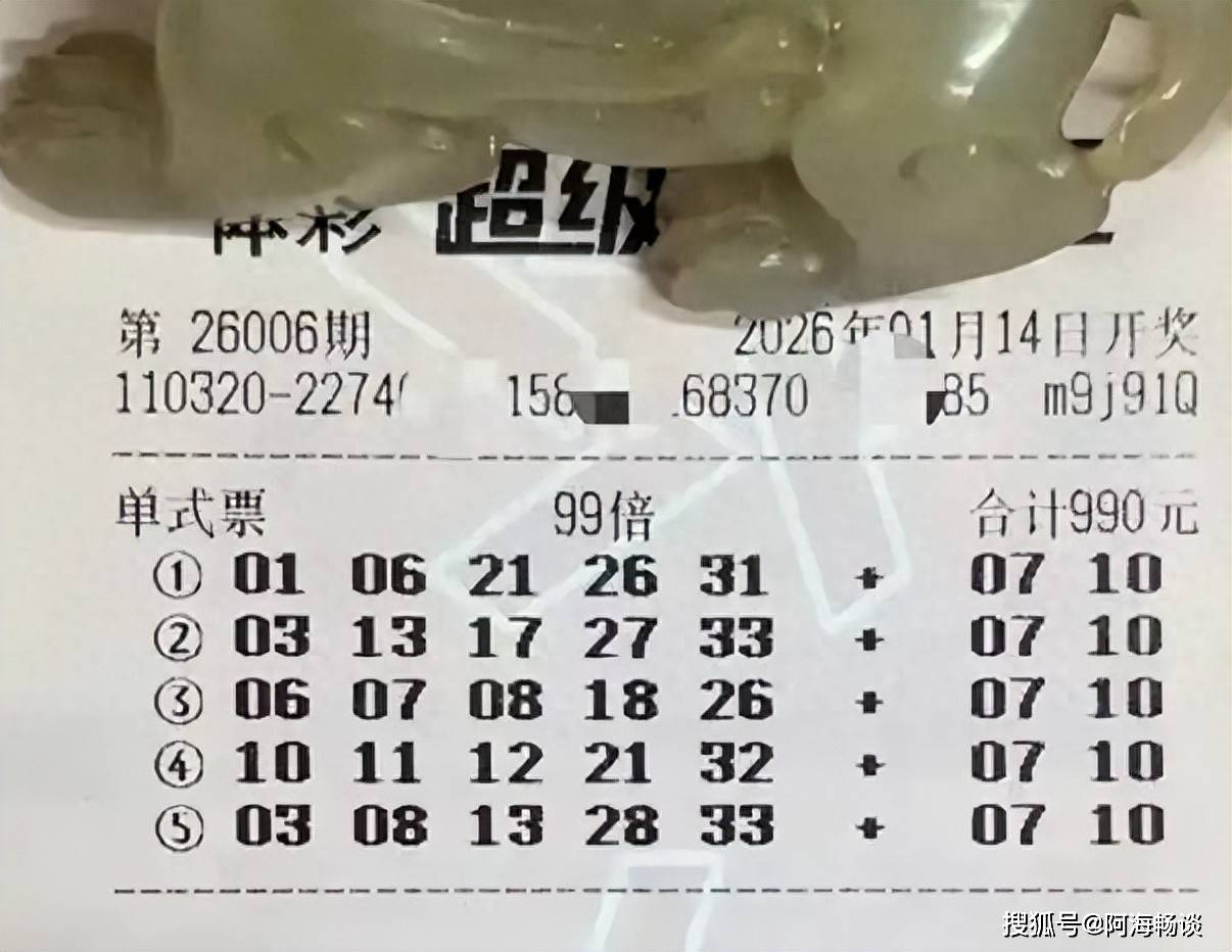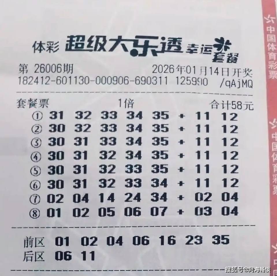 2026-01-15彩票,彩票平台,彩票网站,彩票APP下载,六合彩,快三大家好,今天是2026年1月14日,农历十一月廿六,星期三。大乐透第26006期将在今晚开奖,目前已有很多朋友提前晒出了票面。回顾上一期(26005期)的开奖情况:全国共中出一等奖8注,分别落在河北、浙江、山东、河南、湖北、广东(以上各1注基本投注)和陕西(2注基本投注),可谓好运连连。二等奖开出77注,其中20注采用追加投注,单注基本奖金200,399元,追加奖金160,319元。了解完上期开奖结果,接下来,就让我们一起欣赏本期精彩的晒票吧。