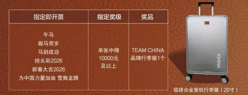 2026-01-19彩票,彩票平台,彩票网站,彩票APP下载,六合彩,快三(“午马”“骏马贺岁”“马到成功”“抢头彩2026”“新春大吉2026”“为中国力量加油 雪舞龙腾”),即可额外获赠TEAM CHINA品牌行李箱1个。赠品数量共300个,若3月12日前赠品赠完,奖上奖活动提前结束。具体奖励规则详见下表。
